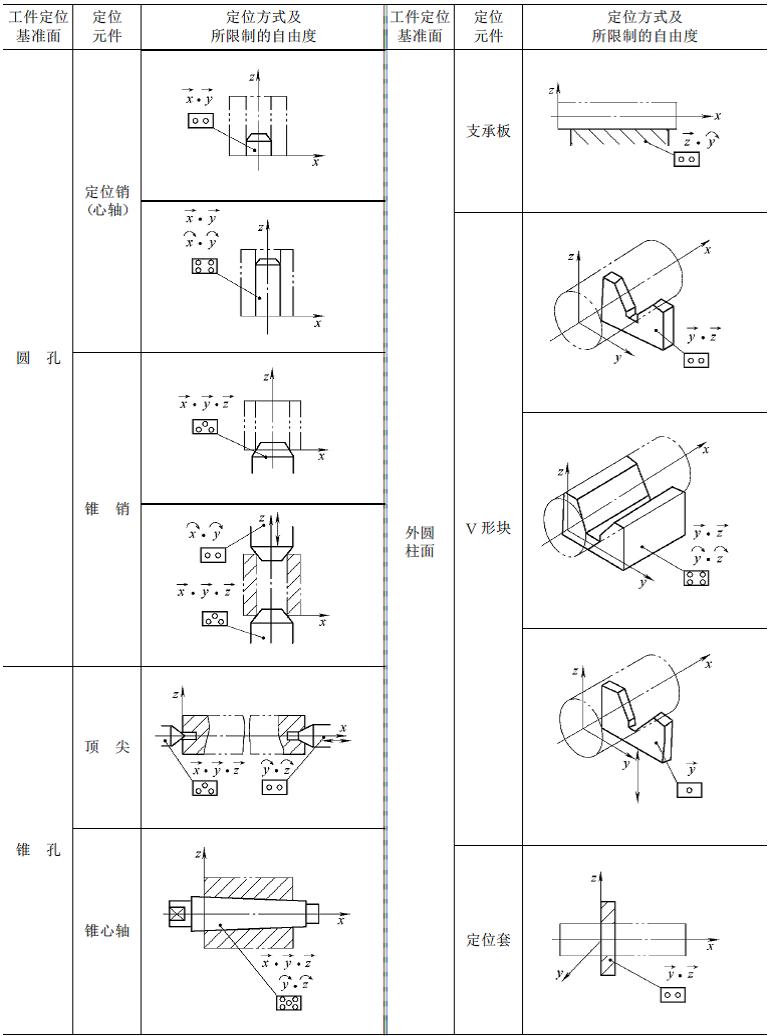 如果重复限制相同自由度的定位支承点之间存在严重的干涉和冲突,以致造成工件或夹具的变形,从而明显影响定位精度,这样的过定位必须严禁采用。表1-1列举出了常见典型定位方式及其定位分析情况。
